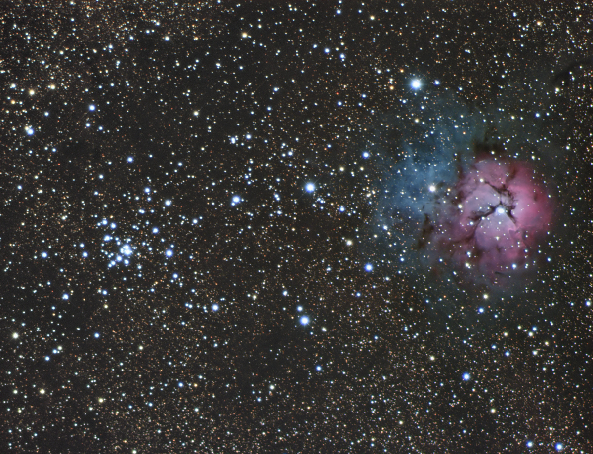 La nébuleuse Trifide partage la vedette de cette région extrêmement riche du ciel avec de nombreux objets brillants à proximité, notamment la nébuleuse de la Lagune située une paire de degrés au nord-ouest.