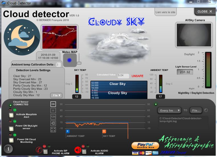 Un projet qui me tenait à coeur depuis de nombreuses années. Dévelloper mon propre système de detection de nuage , permettant ainsi de surveiller l'état du ciel pendant les prises de vues Astrophotographiques et d'arreter en cas d'alerte les prises de vues et d'emêttre diverses alarmes. Ce projet comprend la mise au point simple d'un boîter de détection composé de 2 capteurs et la mise au point du logiciel associé.
