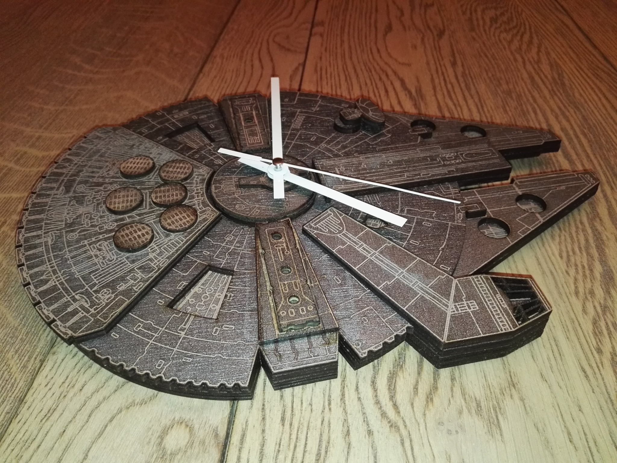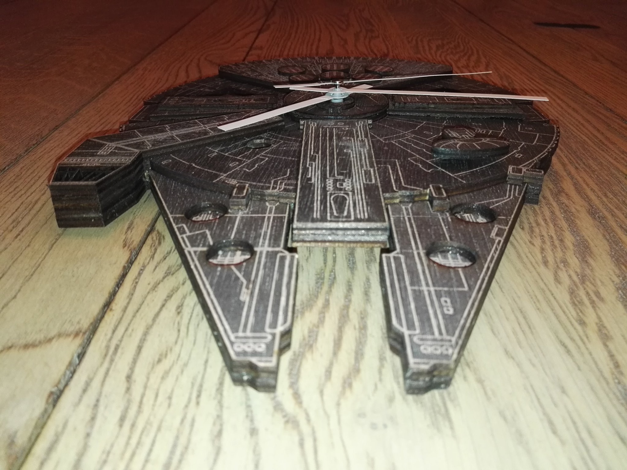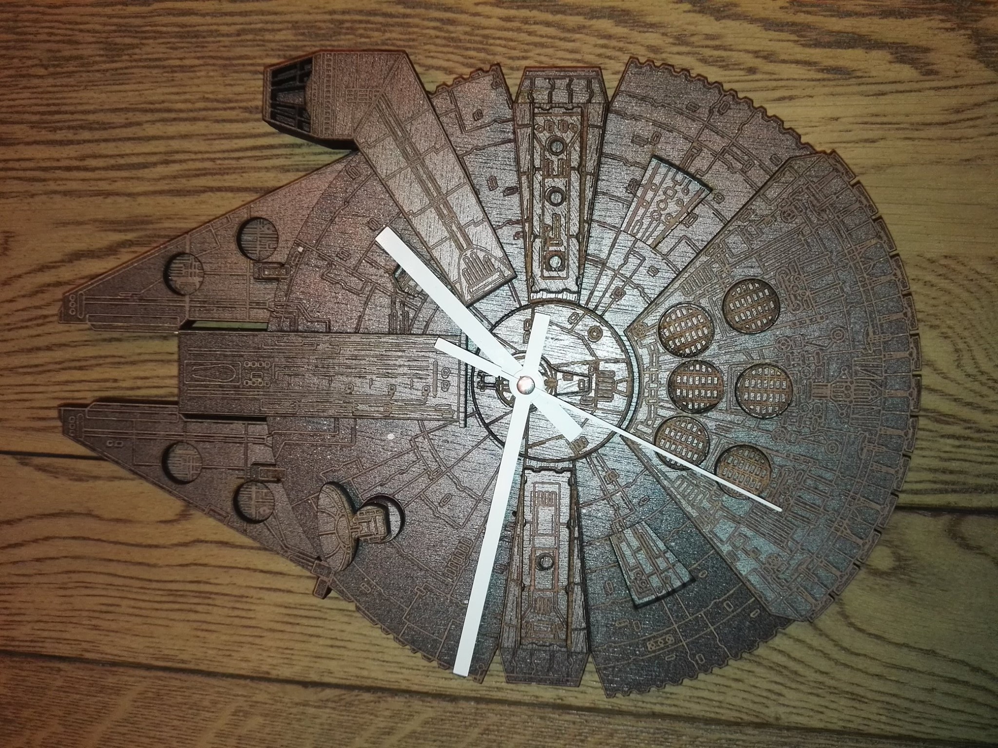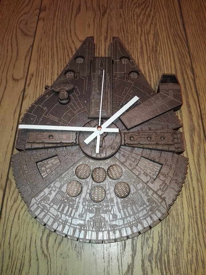 Réalisé sous Inkscape en contreplaqué de 3 et 5 mm en 5 couches différentes pour donner du relief à l'horloge.